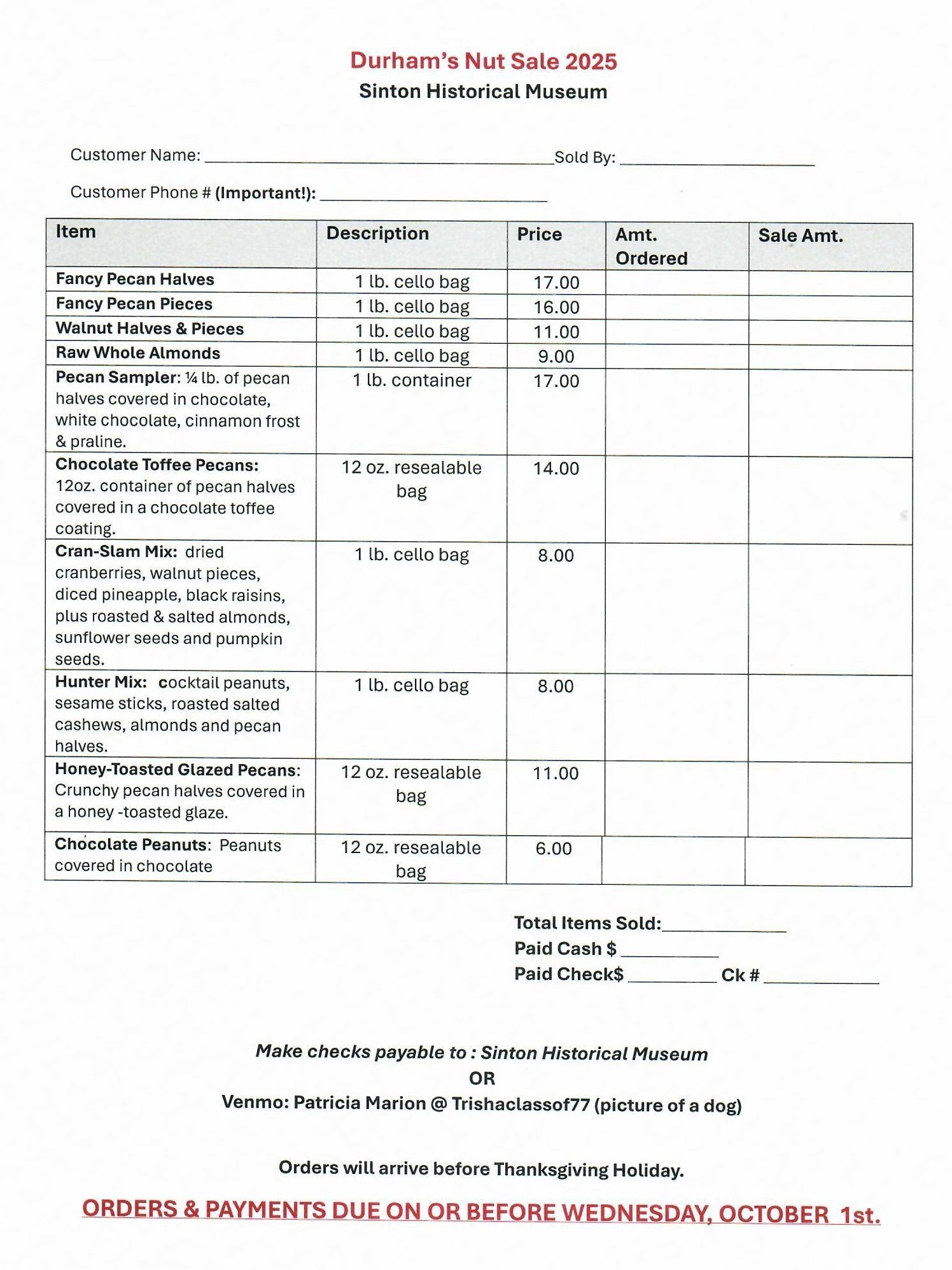 The Museum Board has started their annual nut sale. There are several varieties of nuts to choose from. Since we are a free-admission museum, the proceeds will help to keep the museum doors open to the public. Your support will be greatly appreciated!