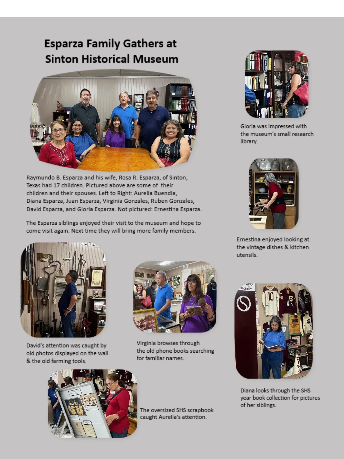 Some of the Esparza siblings and their spouses visited the museum this afternoon. They had a great time reminiscing about their childhood and growing up in Sinton, Texas. They plan to make a return visit and bring more family members.