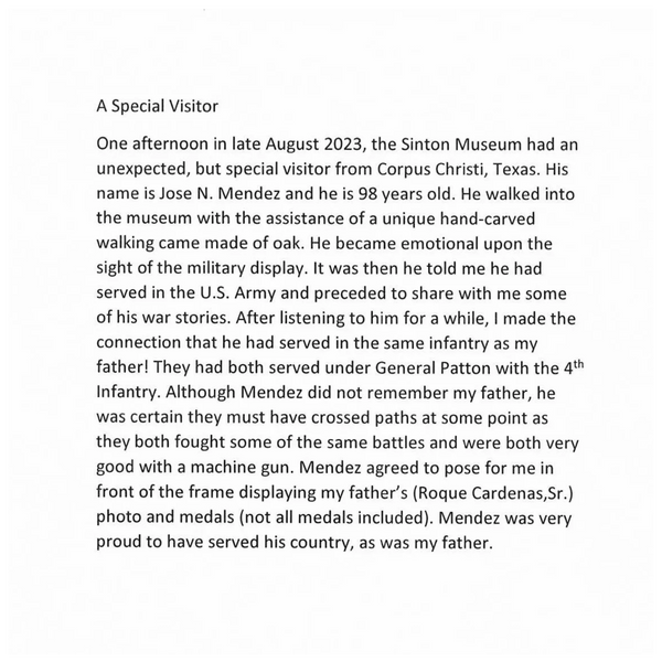 The museum is pleased to participate in the Blue Star Museums program for the summer of 2025. The program will run from Memorial Day, May 26 to Labor Day, September 1. Blue Stars Museum is a partnership between the National Endowment for the Arts and Blue Star Families, in collaboration with the Department of Defense and other participating museums across the America. Find the list of participating museums at arts.gov/Blue Star Museums. Mary A. Carter, advisor for NEA, states, "This program connects military service members and their families with our country's heritage and culture." The Sinton Historical Museum will be presenting each Blue Star visitor with a special lapel pin.